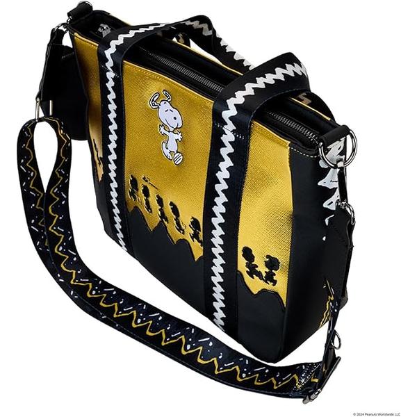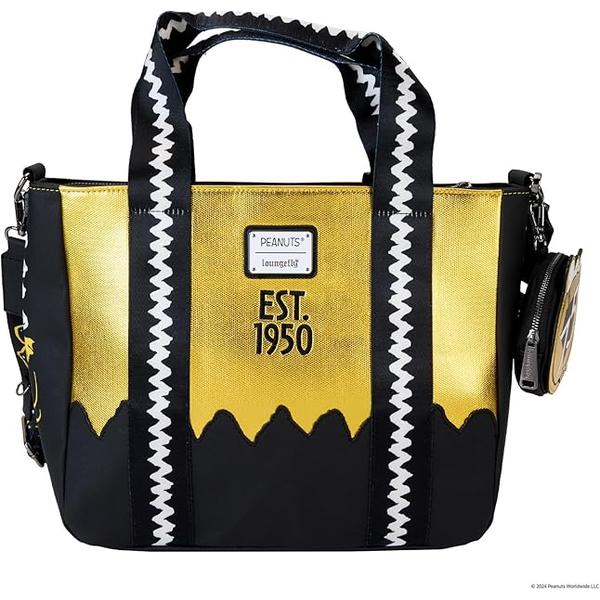 Celebrate the 75th anniversary of Peanuts with this tote bag featuring the whole gang. Charlie Brown's signature wavy stripe makes several fun appearances on this bag, starting with the die-cut waves on the bottom front. Above, the whole gang appears as embroidery, in silhouette form, against a textured, shiny yellow background. Snoopy is above, doing a happy dance. A coin purse marking the 75th anniversary gives Snoopy an opportunity to make an encore appearance, snoozing on top. Flip the bag around, and you'll find the words "Est. 1950," to recognize 75 years of Peanuts characters. Pack your daily essentials in this roomy tote to commemorate a milestone anniversary and add a little character of your own.