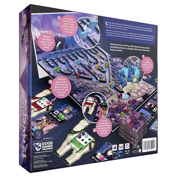 In 12 Rivers, players lead one of four tribes and take turns sending warriors to climb the mountain. The warriors camp near the river to collect Nature's bounties and bring these resources to villagers in need. Warriors can collect more valuable bounties if they move toward the origin of the river, but more camp tools have to be paid as well. After five rounds, the bounties to the villagers will be scored for players based on the rarity.
