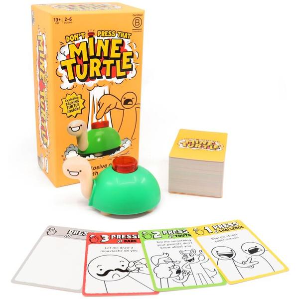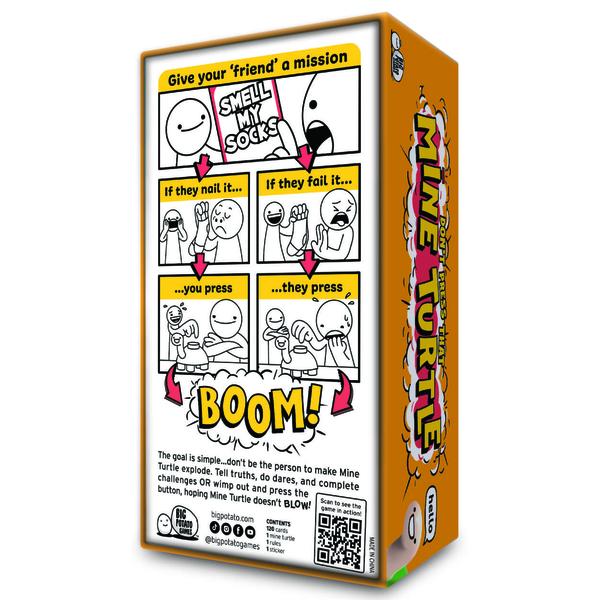 Your mission is to avoid detonating the little guy by completing challenges, doing dares and telling hard truths. The player to make Mine Turtle go BOOM! has lost the game. No one is safe in Mine Turtle. If you give a player a mission and they refuse it or fail it, they have to push the button and risk detonation. However, if you dish out a mission and they nail it, then your evil plan has backfired and YOU have to press Mine Turtle – and every press could be your last.