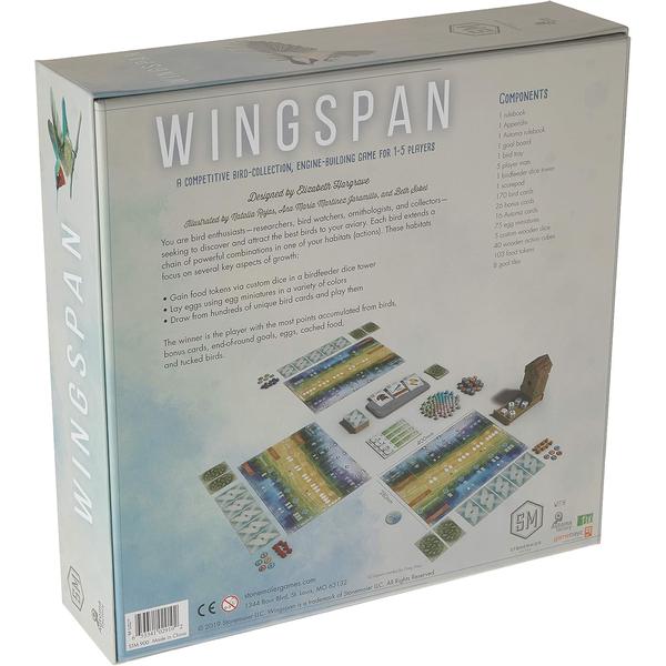Wingspan is a competitive, medium-weight, card-driven, engine-building board game from Stonemaier Games. It's designed by Elizabeth Hargrave and features over 170 birds illustrated by Beth Sobel, Natalia Rojas, and Ana Maria Martinez.