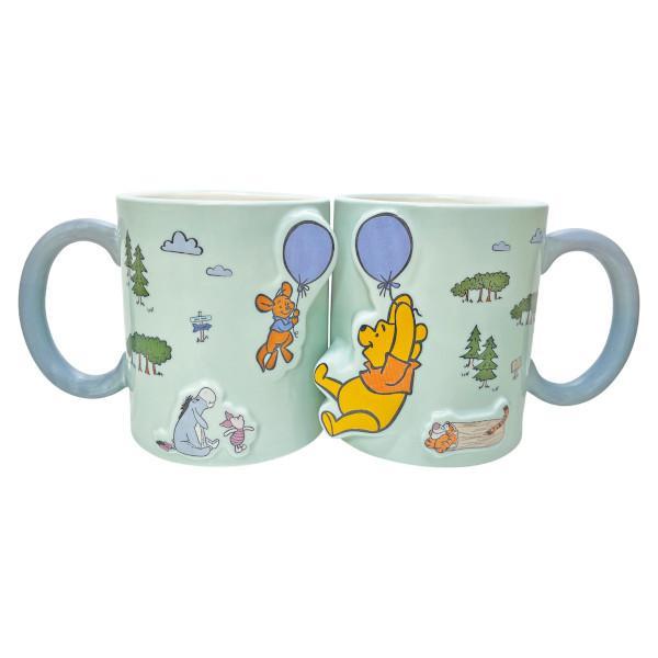 The two mugs side by side show a scene where Pooh Bear and little Roo fly through the air holding blue ballooons. Their friends from the Hundred Acre Wood, Eeyore, Piglet and Tigger watch on.