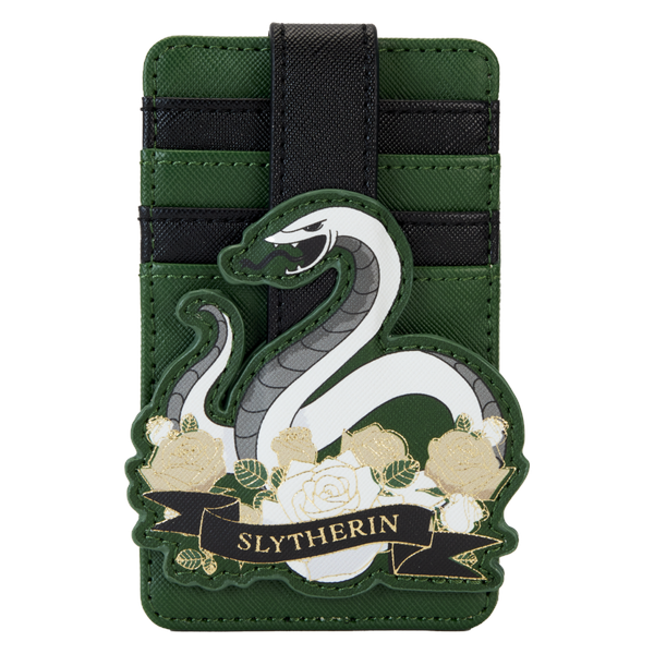 Stop and smell the roses while representing your House! Our Loungefly Harry Potter Slytherin House Tattoo Card Holder is perfect for growing your love of all things Harry Potter. On the front of this elegant forest-green card holder, an applique Slytherin symbol of the snake appears to strike among white and pale gold-colored flowers. A banner, with "Slytherin" printed on it, appears below. This applique serves as the flap, which snaps closed to secure cards. Foil details add an elevated touch. There are approximately four slots for holding cards, and on the back, you'll find one clear slot for displaying your ID.