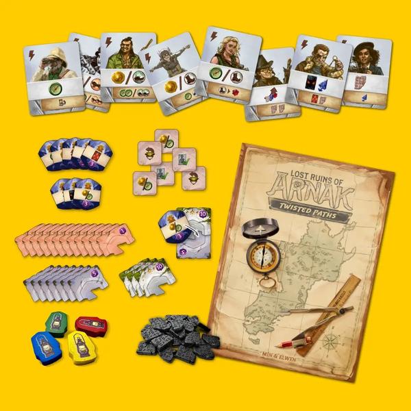 Inside the Adventure Chest is a fresh addition to the world of Arnak: the new expansion Twisted Paths. This expansion brings a new double-sided map bigger than the one in the base game and includes two new research tracks, each with unique mechanisms and components (like brand new temple tiles or new resources—dark tablets).